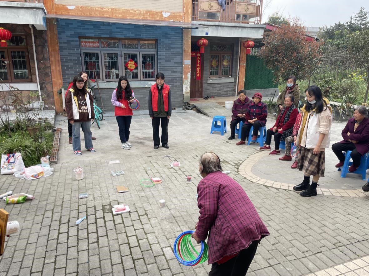 随后,同学们和老人们一起进行了“夹乒乓球”和“套圈夺宝”两个游戏。老年人在参与游戏的过程中既可以活动筋骨、锻炼身体,又可以带来愉悦感。