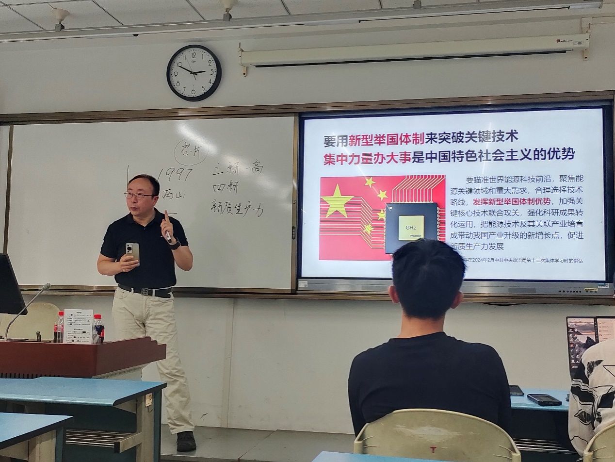 院长杨海洋教授于通博楼109给柳林校区的学生讲授了题为“加快形成新质生产力,推动经济高质量发展”的专题思想政治理论(专题)课,从“是什么”“为什么”“怎么办”的理论逻辑,向大家介绍了新质生产力提出的时间轴和大背景、新质生产力的概念与内涵以及加快形成新质生产力的路径和着力点。