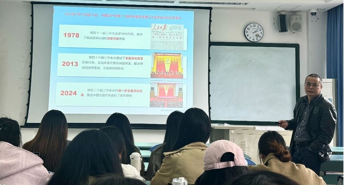岳敏书记于明德楼203教室给光华校区的学生讲授了题为“深入学习贯彻党的二十届三中全会精神 争当奋发有为的时代新人”的专题思想政治理论(专题)课,本次课程旨在学习宣传党的二十届三中全会精神,引导我院学子们树立正确的价值观、人生观和世界观,培养他们成为担当民族复兴大任的时代新人。