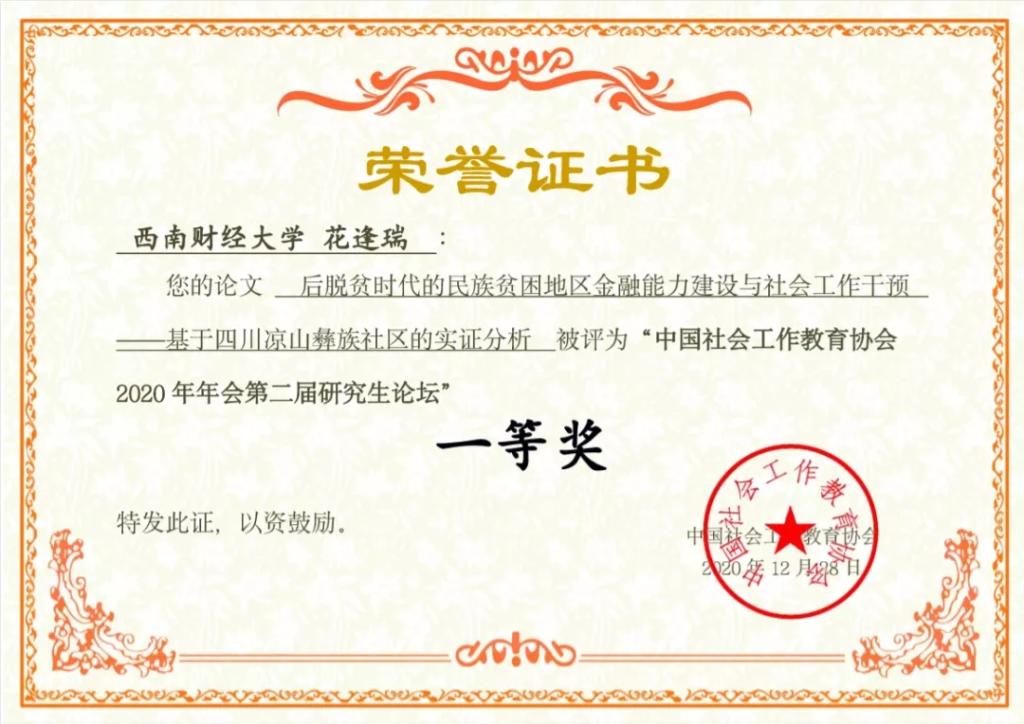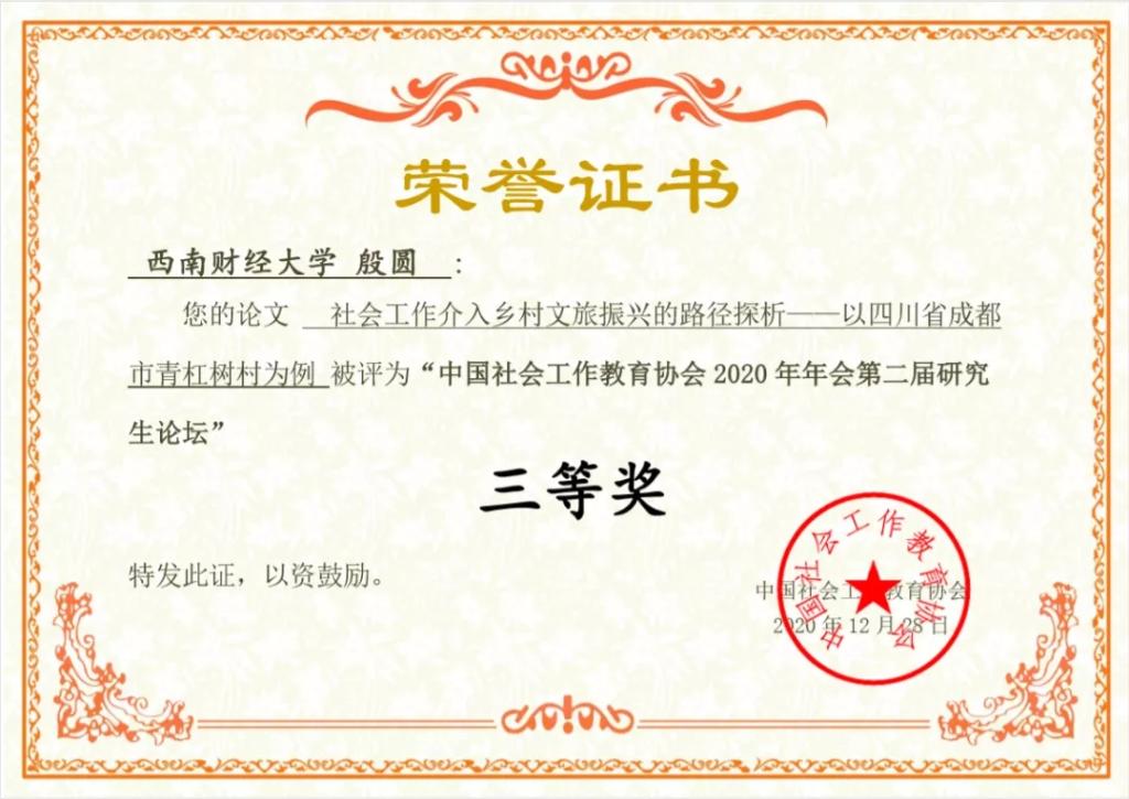 其中2020级花逢瑞在会议中做了《后脱贫时代的民族贫困地区金融能力建设与社会工作干预------基于四川凉山彝族社区的实证分析》的报告,并荣获一等奖。2019级刘恒璐参赛论文题为《社工服务机构劳动关系管理对员工离职倾向的影响研究--基于工作满意度为中介变量的分析》,荣获二等奖。2020级殷圆参赛论文题为《社会工作介入乡村文旅振兴的路径探析------以四川省成都市青杠树村为例》,荣获三等奖。