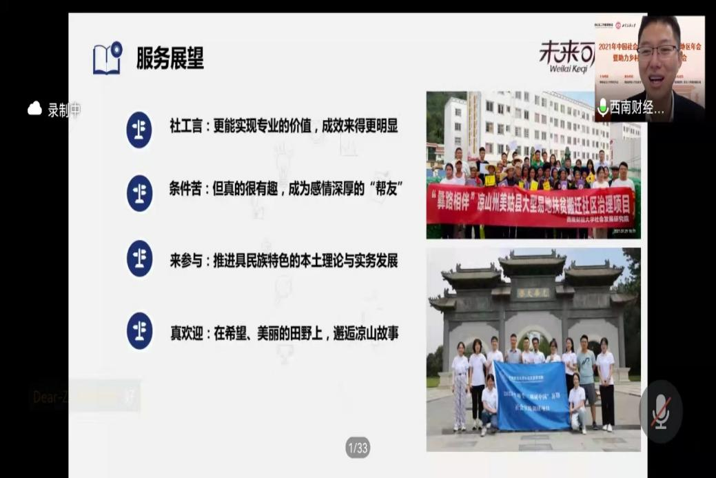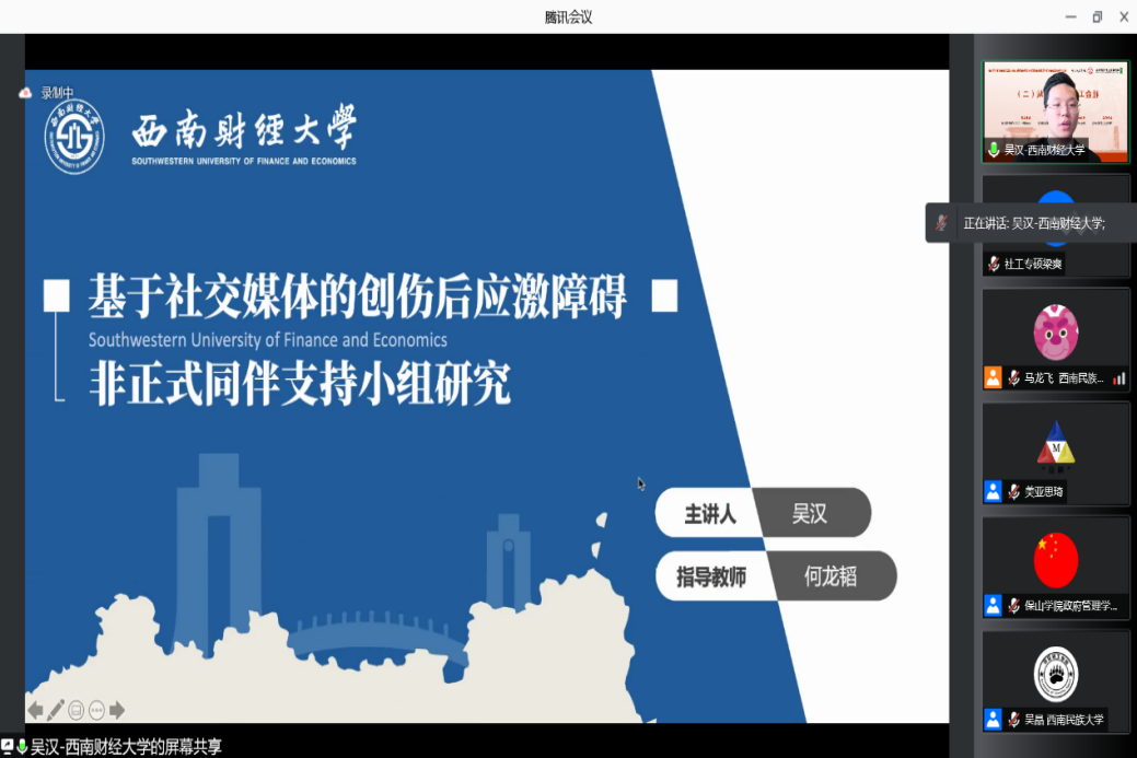 2021年11月13日,中国社会工作教育协会西南地区年会暨助力乡村振兴社会工作研讨会于在线上顺利举办,我院社会政策与社会工作研究所李权财老师、2020级社会工作专业学生李孟华同学和吴汉同学参加此次会议,并做精彩报告。本次会议由中国社会工作教育协会主办,西南民族大学民族学与社会学学院、西南民族研究院承办。