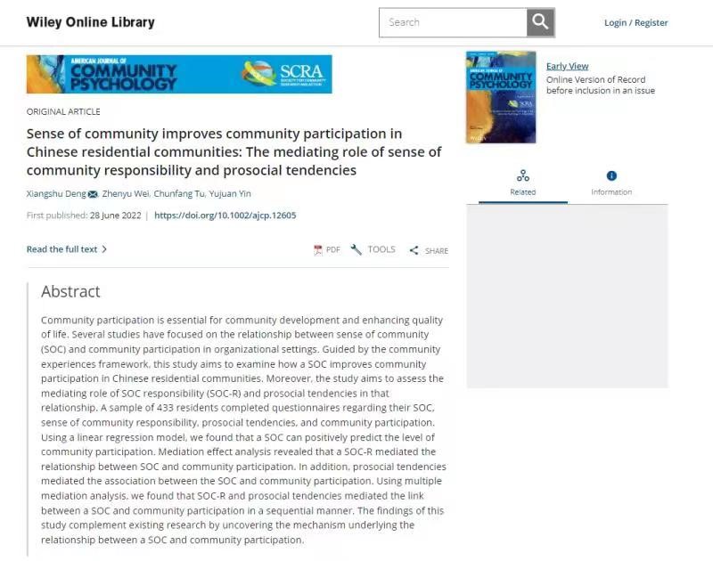 2022年6月28日,社会工作国际顶级期刊《American Journal of Community Psychology》(2022年IF=3.554,社会工作领域期刊国际排名第三)在线发表我院教师邓湘树、魏真瑜等撰写的论文《Sense of community improves community participation in Chinese residential communities: The mediating role of sense of community responsibility and prosocial tendencies》。该文揭示了提升我国居民参与社区治理的心理路径。