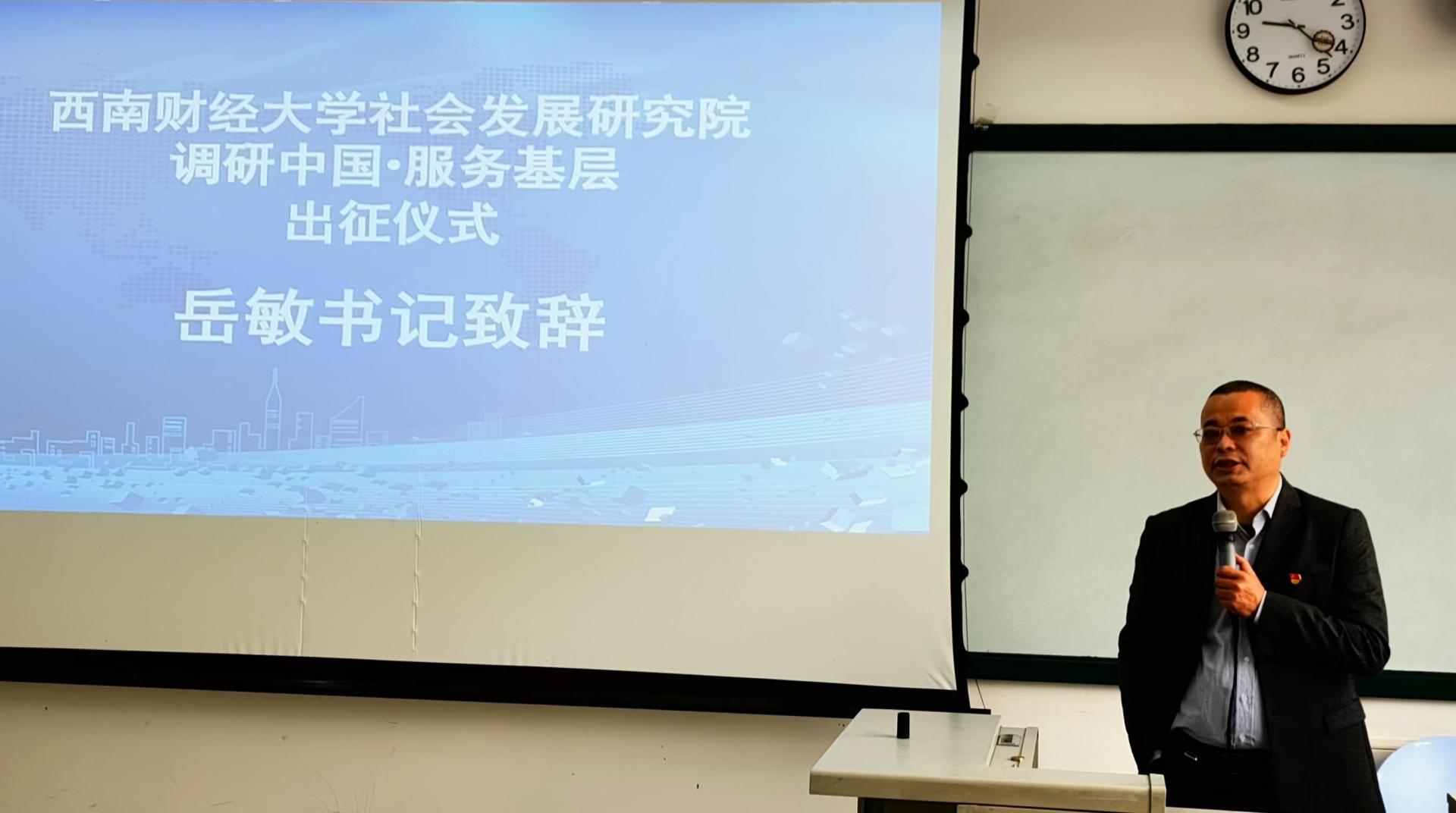 首先,岳敏书记进行了致辞,在致辞中岳书记说明了开展调研中国和服务基层的意义,鼓励学生深入调研,了解国情和基层需求,并在实践中大胆尝试,运用社工理论和方法关怀弱势,扎实开展服务。同时还强调了实习中的纪律,最后为大家调研及实践服务送上了浓浓的祝福。