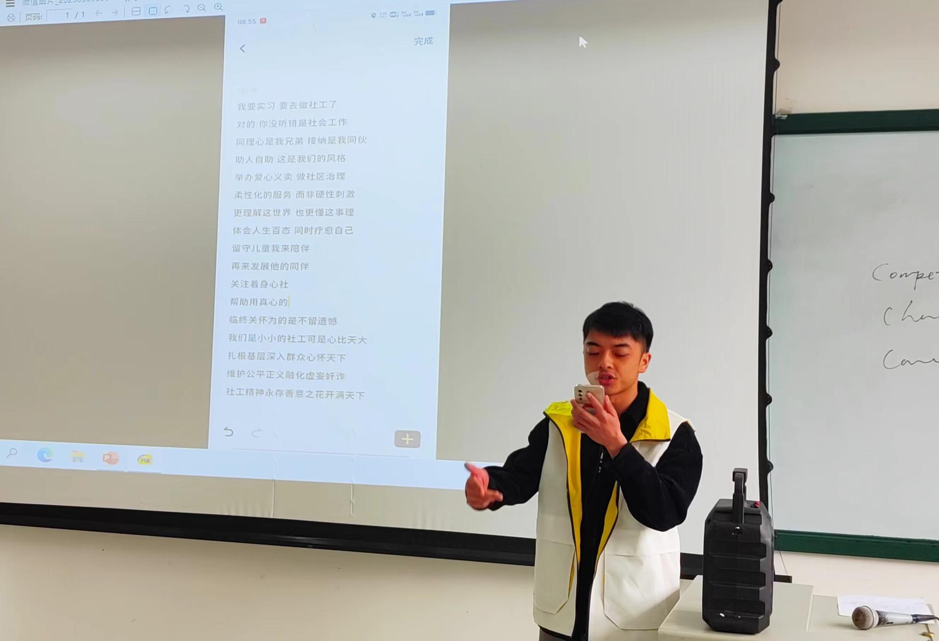 学生代表黄晓虎通过自编自导的歌曲,解析了社工调研实践的内容和任务,也表达了对实习的期许。