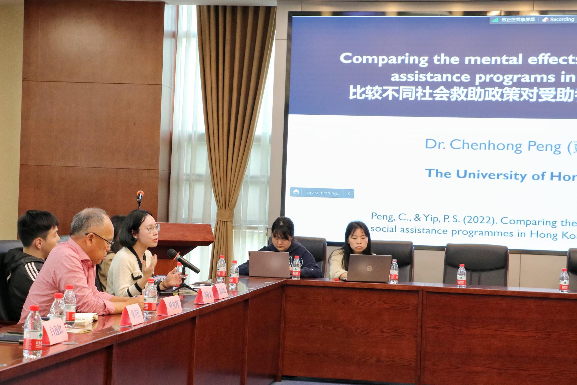 随后,来自厦门大学的常青松副教授,香港大学的彭晨虹助理教授、毕楷文博士和白逸铭博士分别分享了自己的研究内容。常青松副教授分享了中国未成年人自杀意念、自杀计划以及自杀尝试发生率的系统回顾及分析;彭晨虹助理教授分享了社会救助政策与精神健康的相关内容,认为在设计社会福利项目和评估其效果时应更多的关注对心理健康的影响,社会福利项目的污名最小化是放大社会援助项目对心理健康积极影响的一种方式;毕楷文博士分享了四篇自己发表的研究,包括疫情期间的睡眠研究等,展示出香港大学叶兆辉教授团队极强的学术能力;白逸铭博士分享了家庭生育实践和态度,认为应设计涵盖婚恋、生育、教育、住房、养老、社保等方面的连续支出,优化公共服务供给和社会资源配置,才能全面保障家庭发展,营造结果育儿友好型环境,提升家庭的生育意愿和社会整体的生育率。