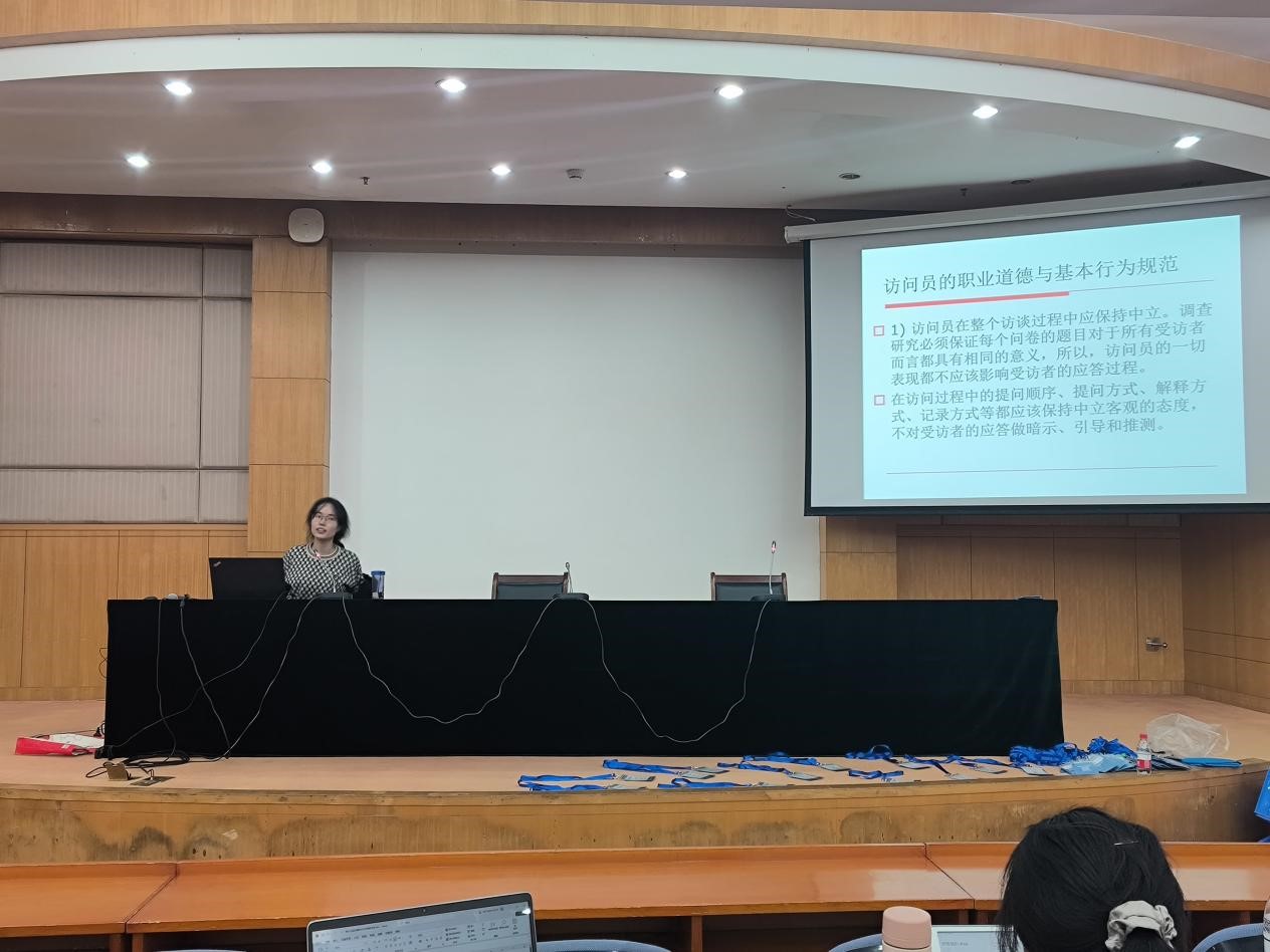 教师陈晶环详细介绍了“如何进入家庭做问卷”,重点针对访问员调查前的准备、访问员相关知识、访问员的安全和问卷访问过程中的主要问题进行了细致阐述,为参与本次调查的师生顺利开展调查扫清障碍。