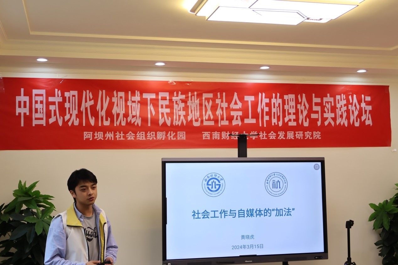 3月22日,在李权财老师、刘曼冬老师的带领下,我院师生一行9人到达阿坝藏族羌族自治州。为更好发挥社会工作专业助力乡村振兴的优势,持续推进民族地区基层治理现代化,我院联合阿坝州民政局在阿坝州社会组织孵化园举办了“中国式现代化视域下民族地区社会工作的理论与实践论坛”。阿坝州民政局副局长泽仁扎西对我院师生一行表示热烈欢迎,并希望通过此次研讨会能更好促进阿坝州社会工作的发展。论坛上,我院师生围绕“对社会工作的看见与省思”“民族地区社会工作设核心能力探索研究”“社会工作与自媒体的 ‘加法’”“社会工作者如何做好访谈?”等主题进行了精彩的分享,为阿坝州社会工作发展提供了系统理论知识与实践经验。