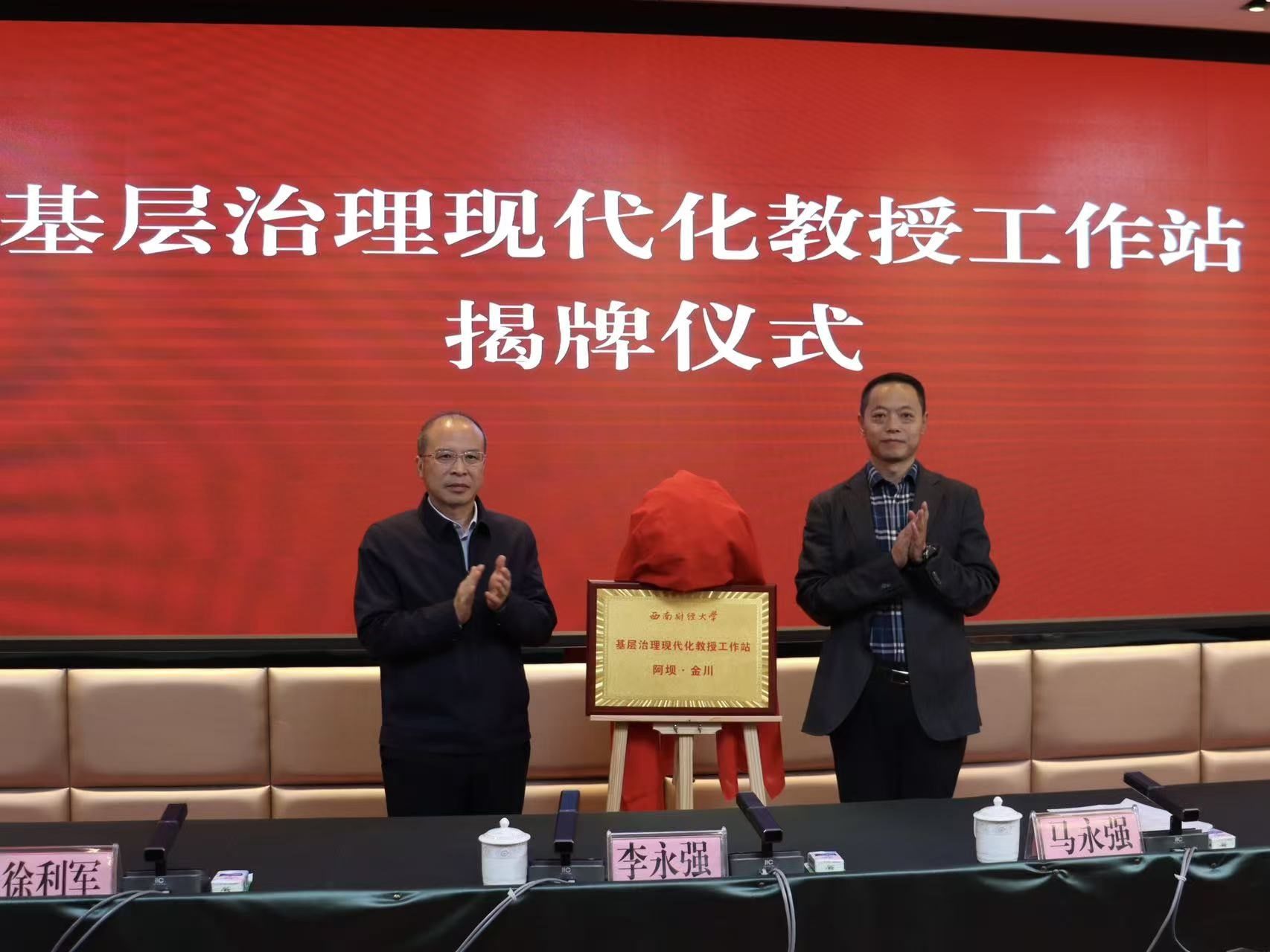 与中共金川县委社会工作部共建的全国第一个基层治理现代化教授工作站,在学校与阿坝藏族羌族自治州金川县定点帮扶座谈会上正式揭牌。学校党委副书记、校长李永强,党委常委、副校长马永强,国内合作与发展处处长徐利军、研究院党委书记岳敏、社会工作专业师生代表,金川县委副书记、县长史志刚,县委常委、县委办主任余璐,副县长叶枫,社会工作部等县级相关部门负责人参加。李永强和史志刚共同为基层治理现代化教授工作站授牌。